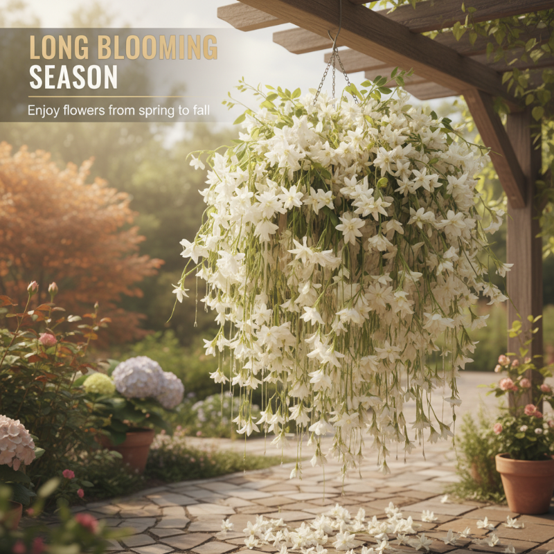 Verwandele deine Außenbereiche in einen traumhaften Rückzugsort! Die kräftige Mandevilla-Rankpflanze bildet dichte, herabhängende Büschel eleganter weißer Blüten und erzeugt einen beeindruckenden Wasserfalleffekt an Spalieren, Zäunen, Pergolen oder Balkonkästen – ein echter Hingucker, der jedes Garten- oder Balkonbild aufwertet!